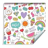 Muralo 243238633 - Papel Pintado para niños, diseño de Unicornios, Frutas, Dulces y Nubes